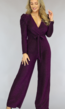 Trefwoorden: paarse glitter jumpsuit, party jumpsuit met pofschouders, pofmouwen, lange mouwen, longsleeve, tailleband, strikdetail, knoopdetail, rechte pijpen, flair, elastisch, glam, sparkle