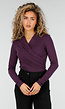 Deze beige top is uitgevoerd in een aangesloten pasvorm en heeft een overslag voorzijde met V-hals. De overslag is vastgestikt in de zijnaad en zorgt voor geplooide details rondom de taille. De top heeft lange mouwen en een rechte onderzoom die tot op de heup valt. De stof is glad en elastisch, waardoor de top nauw aansluit op het lichaam.