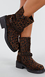 Deze enkellaarsjes zijn uitgevoerd in het bruin met all-over panterprint in zwart. De schacht komt tot net boven de enkel en is afgewerkt met een gevlochten band over de wreef. Aan de buitenzijde bevinden zich twee kleine gespen als decoratief detail. De laars sluit met een rits aan de binnenzijde. De zool is robuust en voorzien van een lage hak.