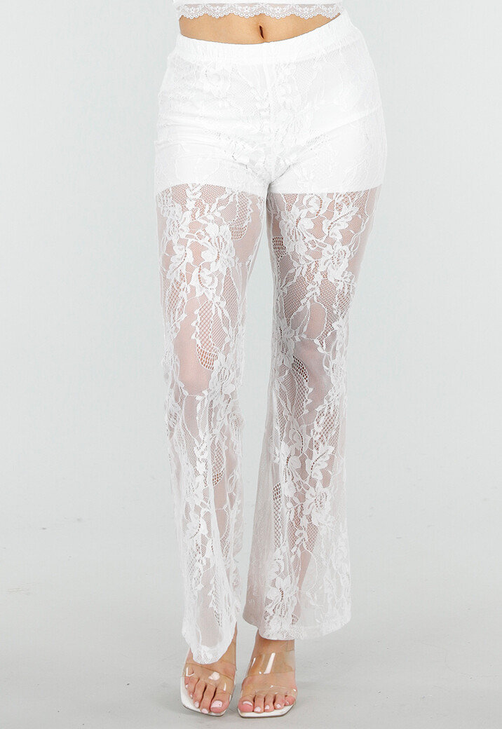 Broek van kant in witte kleur met stretch en een petite pasvorm. Het model heeft flared pijpen en een elastische tailleband. Voorzien van een kort broekje aan de binnenzijde voor extra bedekking.