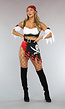 Dit piraten kostuum bestaat uit 6 losse delen. Hij is dus mega-uitgebreid en ook nog eens van een superkwaliteit! Het korte broekje heeft een high waist model en heeft een soort piraten vlag aan de zijkant. Hij sluit netjes aan en aan de bovenzijde zit een elastische band. Bij de set zit ook een riem met gouden gesp. De top heeft een normale halslijn. Hij valt bij de borst geplooid en heeft geen mouwen. Om de armen zitten dus ook losse mouwen welke een leuk zwart strikje hebben. Rond je hoofd knoop je de hoofdband.