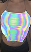 Deze gave top is gemaakt van een stevige reflecterende stof. De top heeft een halter model met een ketting in de nek welke niet te verstellen is. De top is kort en is perfect voor indoor festivals!