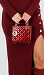 Deze rode handtas heeft een opvallend glanzend oppervlak met een doorgestikt ruitpatroon. De tas is compact uitgevoerd met afmetingen van circa 17 cm breed, 16 cm hoog en 8 cm diep, en heeft een gewicht van 0,6 kg. Aan de bovenzijde zijn twee stevige handvatten bevestigd met goudkleurige ringen. Voorop hangt een decoratieve gouden hanger, die de tas een luxe detail geeft. De tas heeft een gestructureerde, stevige vorm en is aan de onderzijde voorzien van kleine beschermdopjes. Dankzij het formaat is dit model ideaal voor het meenemen van de essentiële items.