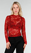 Deze top is uitgevoerd in rood mesh materiaal met een volledig kanten structuur. Het ontwerp heeft een hoge, ronde halslijn en lange mouwen van transparant kant. De top sluit nauw aan op het bovenlichaam en heeft een rechte onderzoom. Het model valt iets korter en eindigt rond de taille. Het kant heeft een doorlopend bloemmotief dat zichtbaar is over de gehele top, inclusief de mouwen en voorzijde.