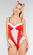 Deze body is uitgevoerd in rood en heeft een combinatie van gladde stof, transparant kant en witte mesh details. De bovenrand is afgewerkt met witte faux fur rand. Het voorpand bevat een kanten inzet die doorloopt naar het middel. De zijnaden zijn voorzien van kanten ruffles. De schouderbandjes zijn verstelbaar. De body wordt geleverd zonder kousen.