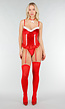 Deze lingerie set is uitgevoerd in rood en bestaat uit een top, een jarretelgordel, kousen, een bijpassende string. De top heeft een gladde stof aan de voorkant met witte zachte vezels langs de bovenrand. De voorzijde is voorzien van decoratieve accenten en een rufflezoom. De jarretelbandjes zijn verstelbaar. De string is uitgevoerd in dezelfde rode stof.