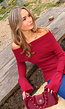 Deze rode trui is gebreid in een fijn ribpatroon en heeft een off shoulder halslijn die recht over de schouders loopt. Het model is licht getailleerd en loopt onderaan uit in een subtiele peplumvorm. De lange mouwen hebben een wijde uitlopende zoom die tot over de pols valt. De stof is elastisch en sluit comfortabel aan. De halslijn is voorzien van een brede, omgeslagen boord.
