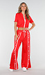 Deze rode two-piece set bestaat uit een cropped vestje en een bijpassende broek met wijde pijpen. Het vestje heeft korte mouwen, een opstaand kraagje en een witte ritssluiting aan de voorzijde. De broek is voorzien van een elastische tailleband met wit trekkoord en afgewerkt met verticale biezen en drukknoopdetails langs de zijkanten. De drukknopen kunnen deels worden geopend, waardoor een extra split ontstaat aan de zijkanten van de broek. Beide items zijn gemaakt van een soepelvallende stretchstof.