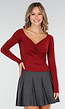 Deze rode top is gemaakt van een gladde, effen stretchstof. De top heeft een aangesloten pasvorm met lange mouwen en een lichte plooival aan de voorzijde. De halslijn loopt schuin in een overslag. De zijkant is voorzien van fijne rimpeldetails die de stof licht optrekken. Het materiaal is soepel en rekt goed mee.
