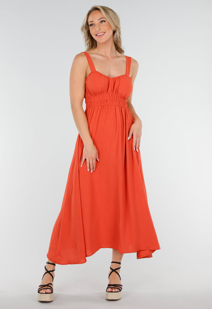 Deze roestkleur jurk heeft een rechte halslijn en verstelbare schouderbanden die zijn afgewerkt met een gestrikte knoop op de rug. De bandjes zijn in lengte aanpasbaar via deze knoopconstructie. De taille is voorzien van een elastisch paneel met meerdere horizontale stiksels die zorgen voor een aangesloten pasvorm. De jurk valt lang en heeft een licht uitlopende rok. De stof is luchtig en licht gestructureerd.
