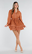 Deze roestkleurige jurk is gemaakt van luchtige meshstof met een subtiele stippenstructuur die zorgt voor extra detail in het materiaal. Het model heeft een elegant kraagje met knoopsluiting aan de voorkant en lange mouwen. In de taille zit een striklint waarmee de pasvorm mooi geaccentueerd wordt. De rok bestaat uit meerdere verstevigde ruffles die zorgen voor volume en een zwierige uitstraling.