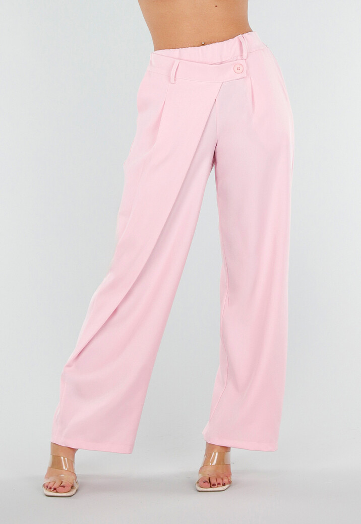 Deze broek is uitgevoerd in een roze tint en heeft een barrel pasvorm. Het model heeft een hoge taille met een overslagdetail aan de voorzijde dat sluit met een knoop. Aan de voorkant zijn subtiele plooien verwerkt die zorgen voor extra ruimte rond de heupen. De broek loopt licht rond uit en versmalt richting de enkel. De tailleband is elastisch. De stof heeft een gladde structuur en valt soepel langs het lichaam.