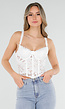 Deze korset top is uitgevoerd in wit kant met een opengewerkt patroon. Het model heeft voorgevormde cups en verstelbare schouderbandjes met een subtiele kanten afwerking. De top sluit aansluitend aan op het lichaam en is aan de achterzijde voorzien van een vetersluiting in korset stijl. De onderzijde is recht afgewerkt en valt tot net boven de taille.
