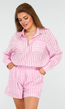 Deze roze set bestaat uit een verticaal gestreepte afgeronde blouse en bijpassende short. Op de voorkant van de blouse zitten twee grote zakken met contrasterende horizontale strepen. De blouse heeft een losse pasvorm met knopen en een kraag. De short heeft een elastische tailleband, steekzakken en rechte pijpen. De set is licht doorschijnend en luchtig, ideaal voor de warme zomerdagen of op vakantie!