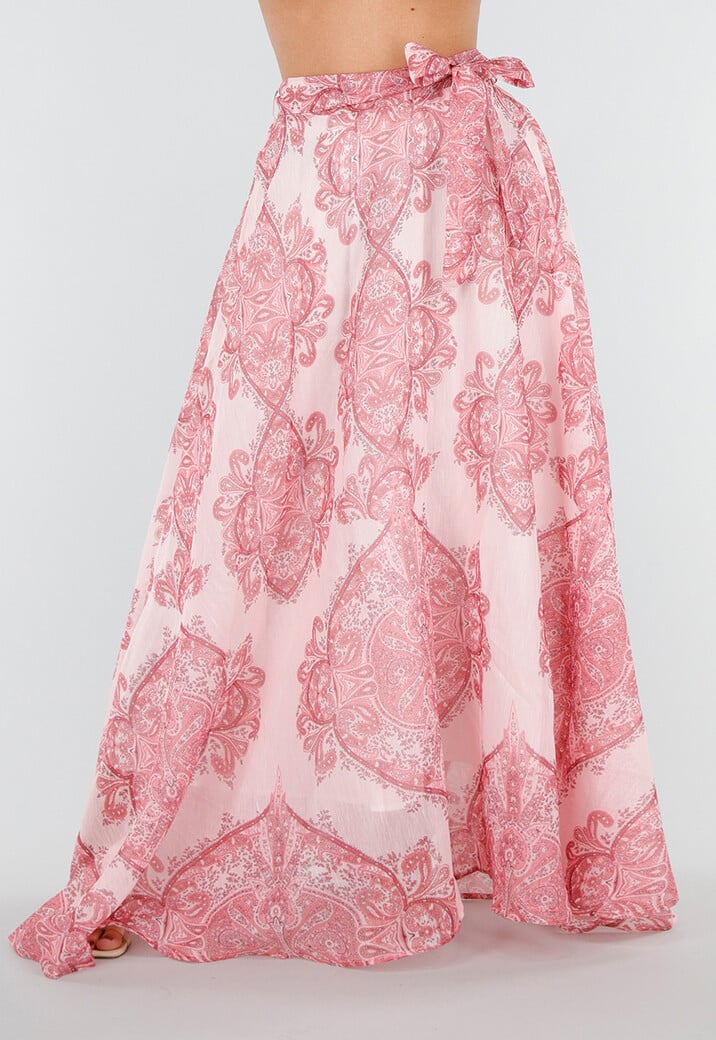 Deze maxi rok is uitgevoerd in een lichtroze stof met een donkerroze paisley print. Het model heeft een hoge taille en sluit aan de voorzijde met een strikceintuur in dezelfde stof. De rok valt lang en heeft een wijd uitlopend silhouet. De buitenstof is licht en semi-transparant en is voorzien van een onderrok.