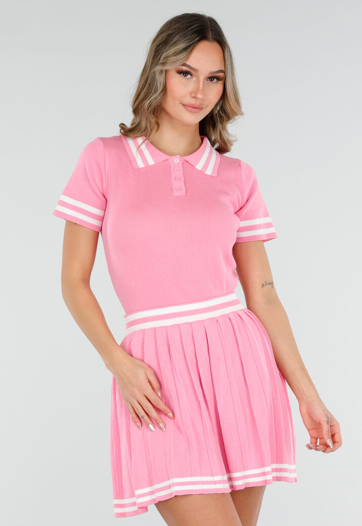 Deze set bestaat uit een aansluitende top en een bijpassende plissé rok in een effen roze kleur. De top heeft korte mouwen, een vaste polokraag en knoopsluitingen aan de voorzijde. Zowel de kraag als de mouwuiteinden zijn afgewerkt met subtiele horizontale strepen. De rok heeft een elastische tailleband en een geplisseerde structuur met streepaccenten langs de zoom. De stof heeft een fijne, gelijkmatige structuur en is rekbaar.