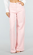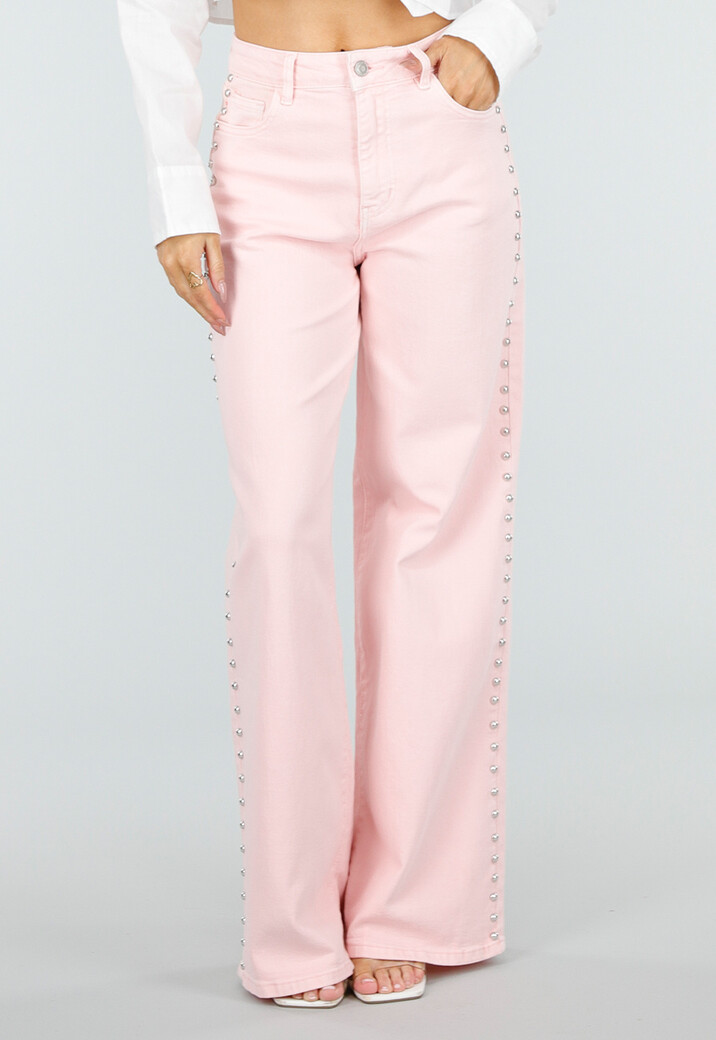 Deze lichtroze jeans is uitgevoerd in een stevige denim stof en heeft een wide leg model. Het model heeft een high waist pasvorm en sluit met een knoop- en ritssluiting aan de voorzijde. De jeans is voorzien van steekzakken aan de voorkant en opgestikte zakken aan de achterzijde. Langs de zijkanten van de pijpen lopen metalen stud details die vanaf de taille naar beneden doorlopen. De rechte wijde pijpen zorgen voor een duidelijke wide leg pasvorm en de tailleband is afgewerkt met riemlussen.