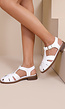 Witte sandalen met een open neus en gekruiste banden over de voet. Voorzien van een verstelbare gesp aan de zijkant en een platte zool. Gemaakt van een glad materiaal met een stevige pasvorm.