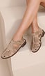 Taupe sandalen met een open neus en meerdere banden over de voet. Voorzien van een verstelbare gesp aan de zijkant en een platte zool.