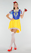 Sneeuwwitje kostuum met een geel en blauw gekleurd jurkje met witte kanten afwerking aan de zoom en halslijn. De korte pofmouwen met rode accenten geven het jurkje een klassieke sprookjeslook. Gemaakt van een zachte, licht glanzende stof met stretch. Ideaal voor themafeesten, carnaval of sprookjesachtige verkleedpartijen.