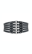 Deze brede tailleriem is ideaal om te dragen als je je taille wilt showen. De voorzijde bestaat uit meerdere lederlook bandjes met een krokodillenpatroon en een paar zilverkleurige studs. In het midden komen ze samen en zitten ze bevestigd aan zilverkleurige ringetjes. Het gedeelte op de rug is elastisch en voorzien van een druksluiting bestaande uit twee drukkers. Deze drukkers zitten bevestigd op een lederlook kroko vlak.