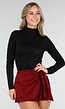 Deze zwarte top is uitgevoerd in een nauwsluitende stretchstof met een ton-sur-ton jacquardstructuur. De stof volgt de lichaamsvorm en heeft een subtiel reliëfpatroon. De top heeft een hoge halslijn en lange mouwen.