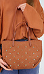 Deze shopper tas heeft een zachte suède-look en is afgewerkt met goudkleurige studs aan de voorzijde. De tas heeft een ruim en praktisch ontwerp en is voorzien van dubbele hengsels, waardoor hij comfortabel te dragen is. Een stijlvolle en speelse toevoeging aan elke outfit.