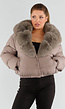 Deze taupekleurige pufferjas is kort vallend en voorzien van een brede, zachte imitatiebontkraag. Het gewatteerde ontwerp met horizontale stiksels en een elastische zoom zorgt voor een comfortabele pasvorm. De jas sluit aan de voorkant met drukknopen en heeft lange mouwen met een rechte afwerking. De bontkraag is afneembaar, zodat je de jas zowel met als zonder kraag kunt dragen.