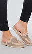 Deze taupe instappers zijn gemaakt van een suède-look materiaal met een zachte teddy afwerking langs de randen. De binnenkant is volledig gevoerd met dezelfde teddy stof, wat zorgt voor extra warmte en draagcomfort. Aan de voorkant zit een decoratief bandje met goudkleurig detail. De zool is plat en licht van gewicht, waardoor de schoen comfortabel loopt. De afgeronde neus en zachte binnenkant maken deze instappers ideaal voor dagelijks gebruik tijdens koelere dagen.