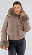 Deze taupekleurige korte winterjas is gemaakt van stevig materiaal en heeft een afneembare faux fur kraag en manchetten. De jas is voorzien van een brede capuchon, twee klepzakken met drukknoopsluiting en een ritssluiting met windflap aan de voorkant. De onderzijde is elastisch ingestikt voor een aansluitende pasvorm. De binnenkant is volledig gevoerd en gewatteerd. De bontdelen aan kraag en mouwen zijn met knoopbevestiging afneembaar.