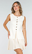 Deze top is uitgevoerd in een zachte crèmekleurige stof met lichte structuur. Het model is mouwloos en sluit aan de voorzijde met een rij gouden knopen. Onderaan de voorkant zit een rechte split in het midden. Deze top is perfect te combineren met het matching rokje.