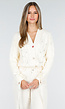 Dit crèmekleurige vest is uitgevoerd in een gebreide kabelstructuur en heeft een V-hals. De voorzijde sluit met twee opvallende knopen, waarvan één rond en één in hartvorm. Het vest is versierd met kleine parels en glinsterende details langs het breipatroon. De mouwen zijn lang en afgewerkt met brede ribboorden. Aan beide mouwzijden zijn satijnen strikken verwerkt die een extra accent toevoegen. Het vest valt tot op de heup.