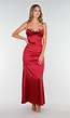 Deze lange jurk is uitgevoerd in glanzend satijn in een diepe wijnrode kleur. De jurk heeft een aansluitende pasvorm en een rechte onderkant tot op de grond. De schouderbandjes zijn voorzien van geborduurde bloemen in roze, geel en groen. De jurk is mouwloos en heeft een open rug met verstelbare dunne bandjes.