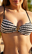 Deze wit zwarte triangel bikinitop is uitgevoerd in een stretchstof met horizontale strepen. Tussen de cups zit een goudkleurig koru-symbool verwerkt. De top heeft uitneembare pads, verstelbare schouderbandjes en een striksluiting op de rug.