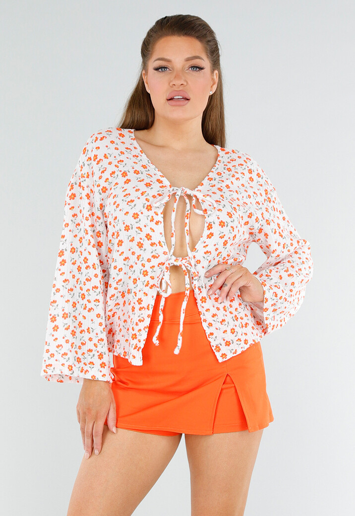 Deze blouse is wit van kleur met een all-over bloemenprint in oranjetinten. Het model heeft een rechte, losvallende pasvorm en is voorzien van twee striksluitingen aan de voorkant. De mouwen zijn lang en licht uitlopend met een losse boordsnit. De halslijn is een diepe V-vorm die extra wordt geaccentueerd door de open voorzijde. De stof is licht en luchtig met een gekreukelde textuur.