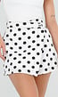 Witte korte rok van denim met een patroon van zwarte stippen. Het model heeft een overslag aan de voorzijde met knoopsluiting op de taille. De rok heeft een aangesloten pasvorm en is gemaakt van stevige denim.