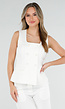 Deze gilet top is uitgevoerd in een witte tint. Het model is mouwloos en heeft een rechte, licht getailleerde pasvorm. De top heeft een vierkante halslijn en een dubbele knoopsluiting aan de voorzijde met in totaal zes knopen. Aan de voorkant zijn twee sierkleppen ter hoogte van de taille verwerkt. De stof heeft een gladde structuur en zorgt voor een nette, gestructureerde uitstraling.
