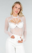 Deze body is uitgevoerd in wit kant met een transparante structuur en een doorlopend bloemmotief. Het model heeft een hoge halslijn met kanten afwerking en lange, semi-transparante mouwen. De voorzijde is voorzien van beugels in de cups voor vorm en ondersteuning en een uitgesneden detail bij de borst met smalle bandjes. De body sluit nauw aan op het lichaam en heeft een aangesloten onderzijde.