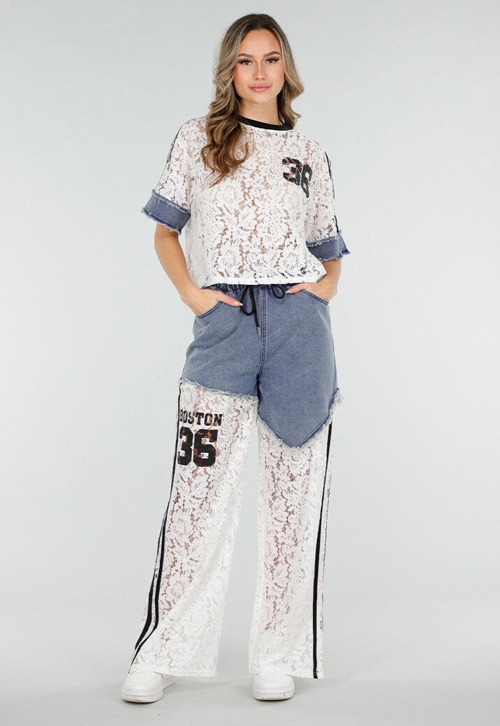 Deze set bestaat uit een top en een bijpassende broek met geïntegreerde denim short. De top is uitgevoerd in transparante kant met korte mouwen, een ronde hals en contrasterende boordafwerking. Op de voor- en achterzijde is een grafische print zichtbaar. De broek heeft lange, rechte pijpen van kant en is voorzien van contrasterende verticale strepen langs de zijkanten. Over de bovenkant van de broek is een vast denim short gedeelte aangebracht met elastische tailleband, trekkoord, steekzakken en rafelafwerking langs de zoom.