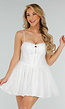 Deze korte jurk is volledig wit en voorzien van een kanten buitenlaag. De jurk heeft dunne spaghettibandjes en een strak lijfje met korsetdetails aan de voorzijde, denk hierbij aan zachte baleinen, haak-en oog sluiting, pads en cups zonder beugels. Er is een subtiele opening onder de buste, ruffelrand boven de cups en een strikje. De rok loopt wijder uit en is gemaakt van meerdere lagen licht doorzichtige stof, waaronder een tule bovenlaag. De achterkant van de jurk sluit middels een blinde rits. De totale lengte valt boven de knie. De jurk is volledig gevoerd.