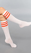 Deze sokken vallen tot onder de knie en zijn gemaakt van een stretchy stof. Ze zijn wit van kleur en voorzien van drie oranje strepen aan de bovenkant.
