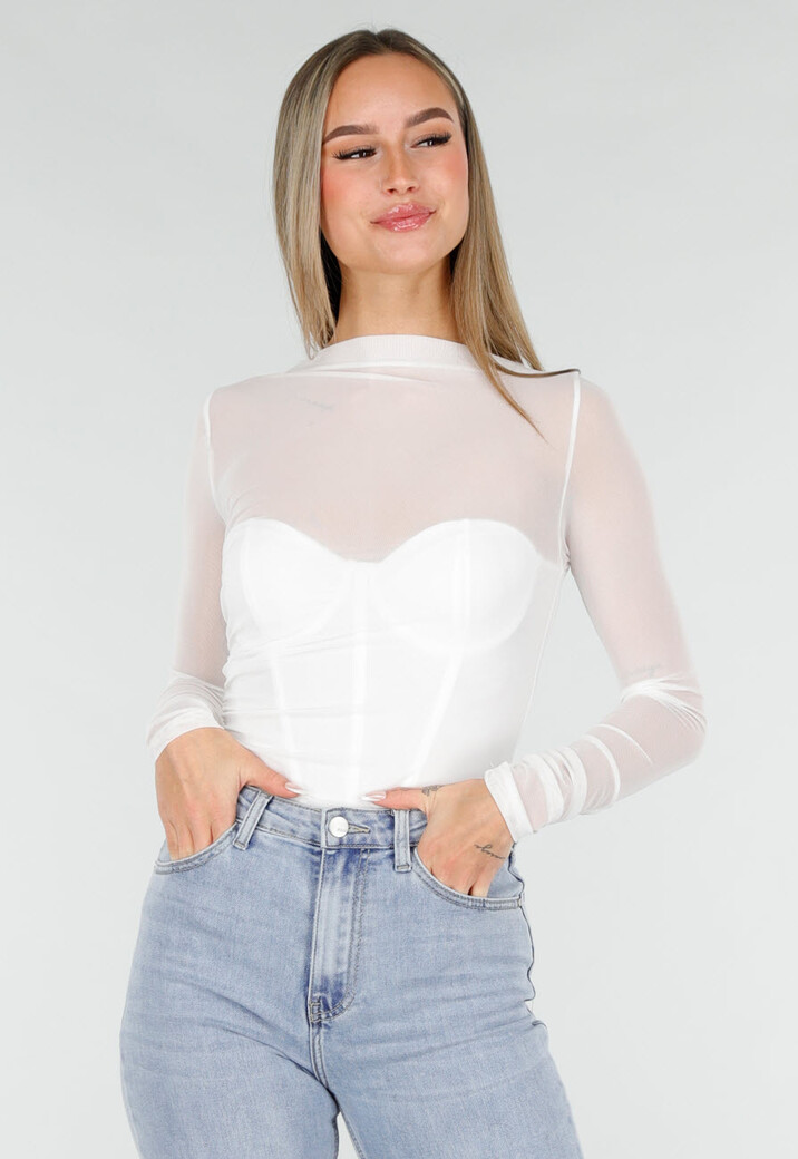 Deze body is uitgevoerd in een transparante witte mesh stof met een aansluitende pasvorm. Het model heeft een rechte halslijn en lange, aansluitende mouwen van mesh die volledig transparant zijn. Het lichaam van de body is voorzien van een vaste korset voering met een beugel en verstevigde baleinen, wat zorgt voor extra ondersteuning en een mooi gevormd silhouet. Hierdoor is het materiaal op het lichaam bedekkend en stevig. De onderzijde is afgewerkt als body, waardoor het model strak in de broek blijft zitten. De body sluit aan de onderzijde met drie drukknoopjes.