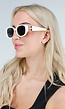 Deze zonnebril heeft een ovaal montuur met een glanzend witte kunststof frame. De glazen zijn donker getint en ovaal van vorm. Het montuur is afgewerkt met brede pootjes en een goudkleurig scharnierdetail aan de zijkant. De pasvorm sluit smal en licht gebogen aan op het gezicht.