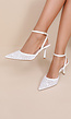 Deze witte hakken hebben een puntige neus en een slanke hoge hak. Het bovenwerk is volledig afgewerkt met kralen, parels en pailletten. De hakken zijn voorzien van een enkelbandje met verstelbare gesp. Het model is open aan de hiel en gesloten aan de voorzijde.