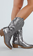 Deze zilverkleurige cowboylaarzen zijn uitgevoerd in een opvallende metallic look. De schacht is voorzien van sierstiksels in westernstijl en loopt aan de bovenzijde uit in een diepe V-vorm met functionele lussen. De rits aan de binnenzijde zorgt voor gemakkelijk aantrekken. De neus is spits en heeft subtiele stiklijnen op de wreef.