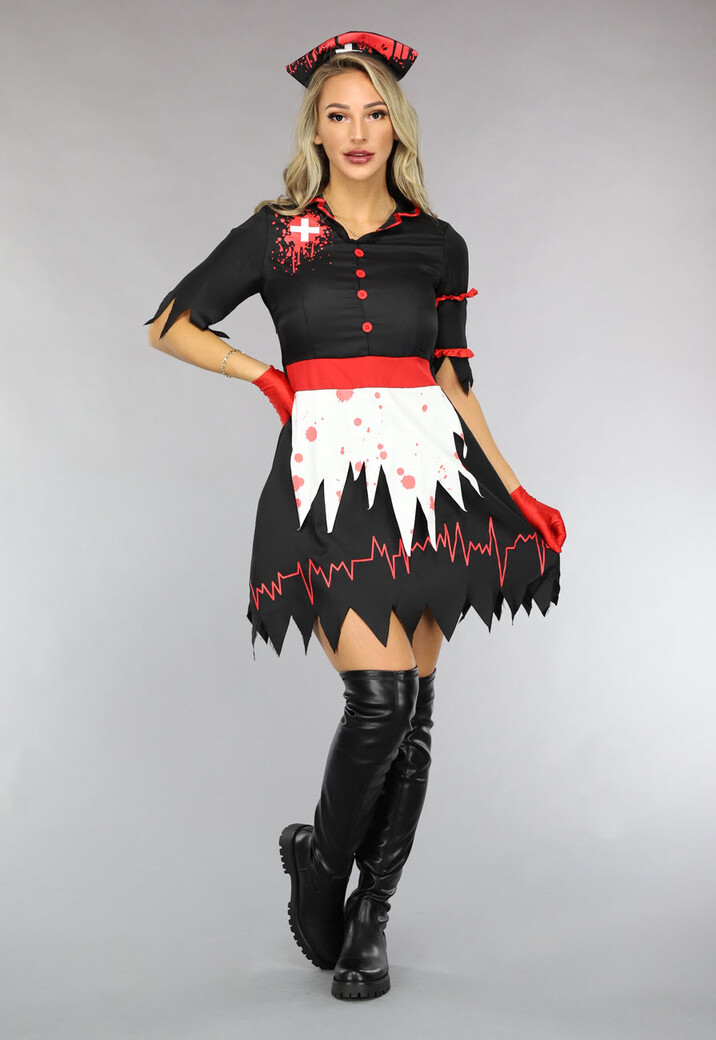 De jurk van het kostuum is een bloederige bedoeling. Het schort van het jurkje is voorzien van bloedvlekken en de onderkant heeft een print van een hartslag lijn. Met de ritssluiting welke aan de zijkant zit kan je de jurk makkelijk aan en uit trekken. In de hals zit een kraag en knoopjes die naar beneden lopen, deze zijn niet echt. Tevens heeft de jurk mouwen welke lopen in een punt, net als de onderkant van de rok. Met de bebloede haaraccessoire, de band om de arm en de rode handschoenen maak je de look helemaal af!