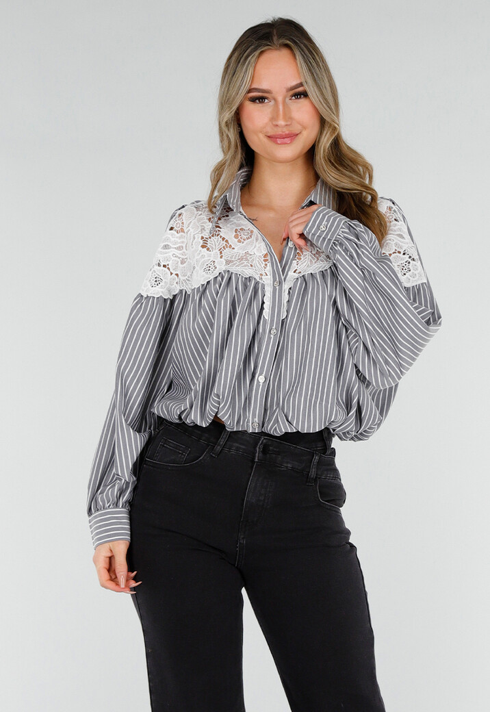 Deze blouse is uitgevoerd in een zwarte kleur met verticale witte strepen. Het model heeft een kraag en glitter knoopjes aan de voorzijde. Het bovenpand is afgewerkt met een wit kanten inzetstuk met opengewerkte structuur. De blouse heeft lange mouwen met manchetten en een licht geplooide aanzet onder het kanten gedeelte. De onderzijde is kort en recht afgewerkt.