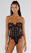 Dit zwarte kanten korset wordt geleverd met een bijpassende string. Het korset is gemaakt van doorzichtig kant met bloemendessin en heeft verstevigde baleinen voor extra vormbehoud. De cups bevatten beugels en zijn aan de bovenzijde afgewerkt met fijne kanten franjes. De voorkant sluit met metalen haakjes over de gehele lengte. De onderrand heeft een licht golvende afwerking van kant. De bijpassende string is uitgevoerd in dezelfde stof en past qua dessin en afwerking perfect bij het korset.