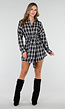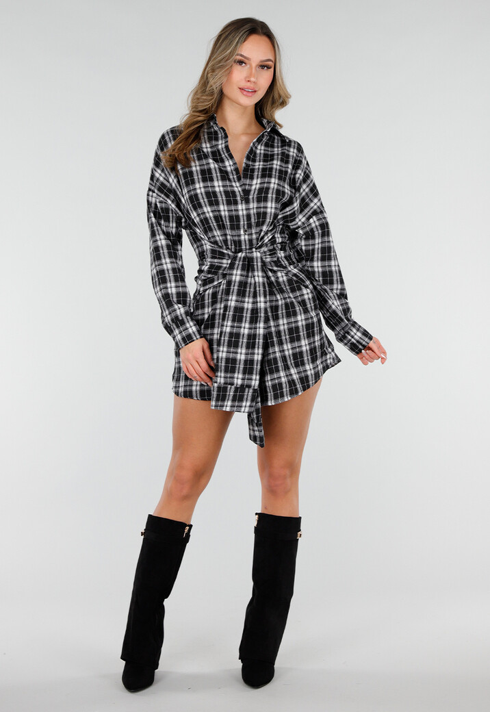Deze blouse jurk is uitgevoerd in een zwart witte ruitprint. Het model heeft een klassieke blousekraag, een doorlopende knoopsluiting aan de voorzijde en lange mouwen met manchetten. In de taille zijn twee extra mouwdelen verwerkt die om de middel gestrikt kunnen worden. Hierdoor ontstaat een verstelbare taille. De jurk heeft een rechte basisvorm en valt boven de knie.