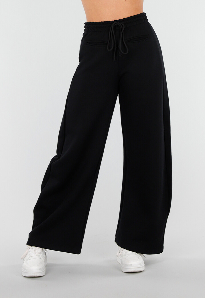 Deze joggingbroek is uitgevoerd in zwart en heeft een barrel model met licht afgeronde, wijde pijpen. De taille is voorzien van een elastische band met aantrekkoord. Aan de voorzijde zitten twee paspelzakken. De achterzijde is afgewerkt met een schuine kontzak. De broek valt los om het bovenbeen en loopt subtiel rond naar de zoom.